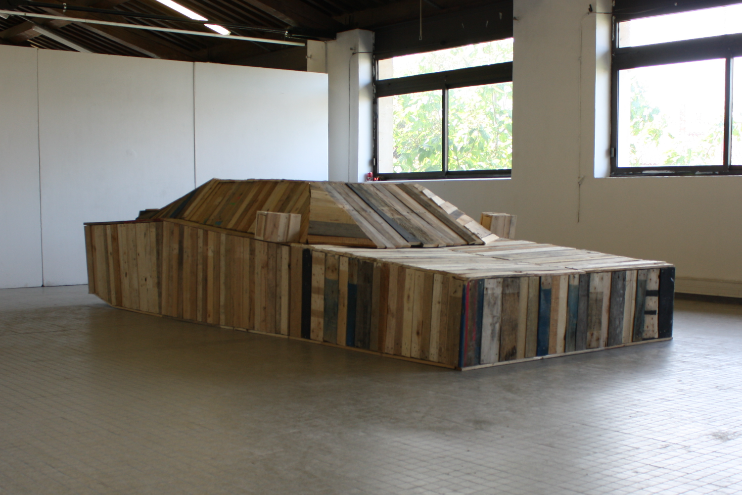 De manière très sommaire les côtes d'une ferrari sont utilisés pour la création du châssis structurant la sculpture recouverte de lattes de palettes.